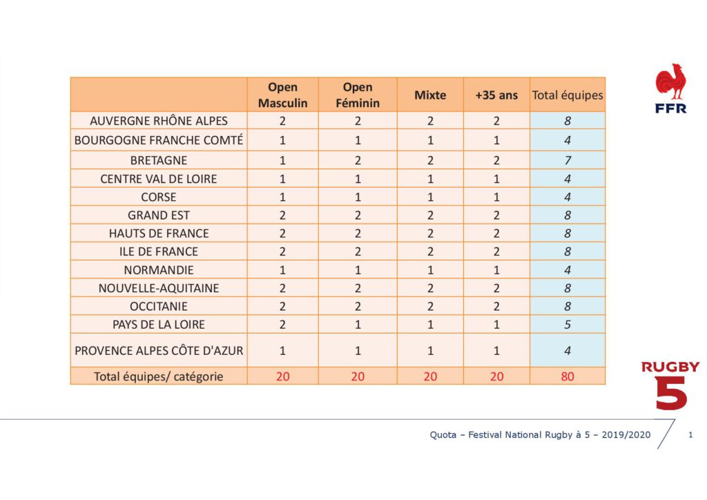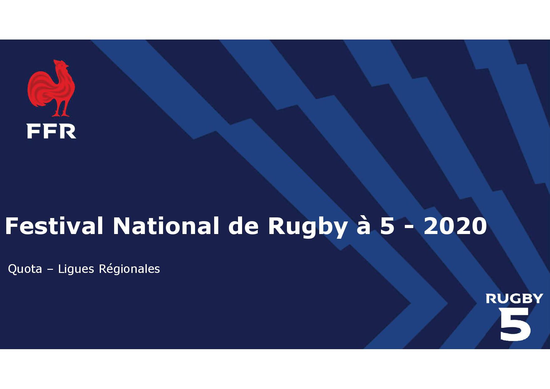 Dans le cadre de l’organisation du Festival National de Rugby à 5 les samedi 13 et dimanche 14 juin 2020 à Blois, la FFR a fixé comme suit le quota de répartition des équipes représentatives par Ligue Régionale, pour les catégories :